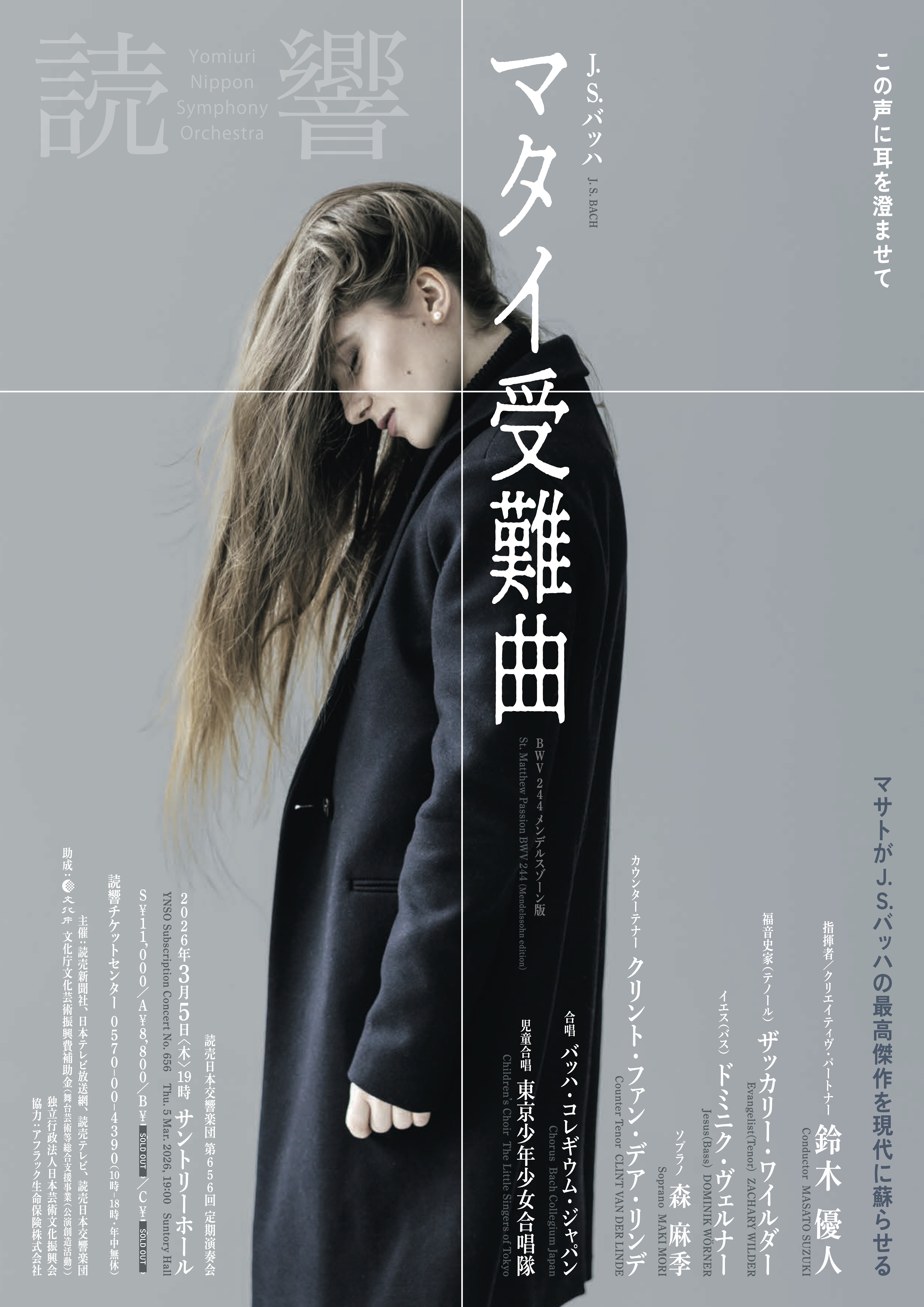 J.S.バッハ:マタイ受難曲 BWV 244(メンデルスゾーン版)/Bass-Chor 最終更新日時 : himawari.t.kenchi7155 読売日本交響楽団 第656回定期演奏会 2026 3. 5〈木〉 19:00 サントリーホール 指揮=鈴木優人福音史家(テノール)=ザッカリー・ワイルダーイエス(バス)=ドミニク・ヴェルナーソプラノ=森麻季カウンターテナー=クリント・ファン・デア・リンデ合唱=バッハ・コレギウム・ジャパン児童合唱=東京少年少女合唱隊J.S.バッハ:マタイ受難曲 BWV 244(メンデルスゾーン版)